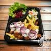 Stek ze schabu z cebulką, ziemniaki lub frytki, świeże surówki